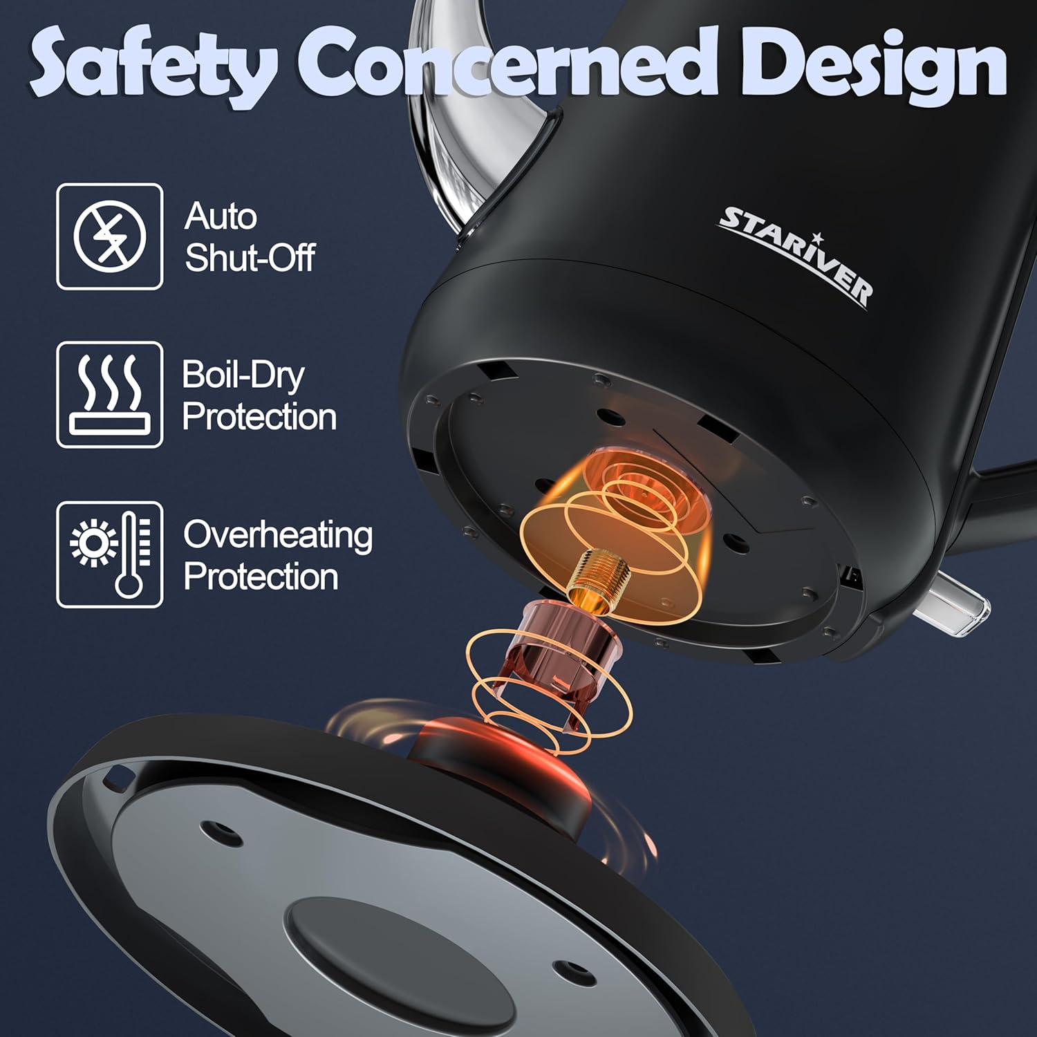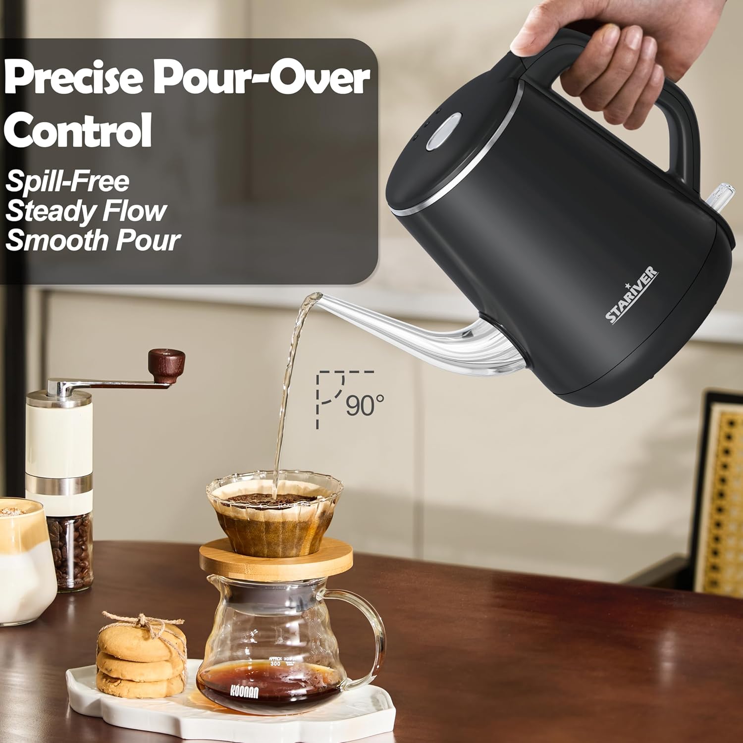 El Hervidor Stariver Cuello de Cisne Negro 0.8L combina diseño elegante y funcionalidad avanzada, ideal para los amantes del café y té. Con su cuello de cisne, ofrece un control preciso del vertido, mientras que sus características de seguridad y tamaño compacto lo convierten en una opción práctica y moderna para cualquier cocina.