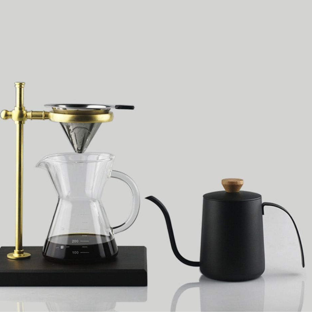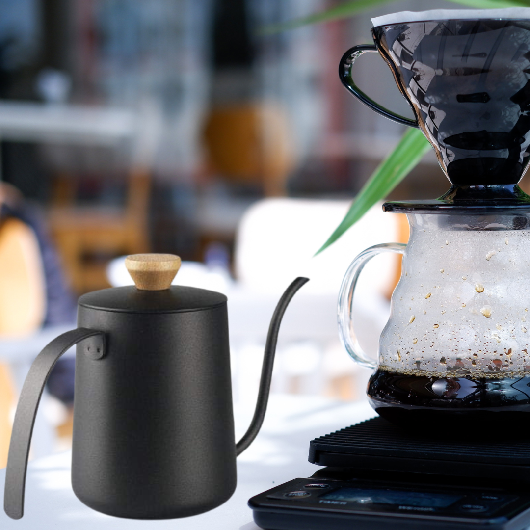 repara tu café con precisión y estilo con esta jarra calentadora de cuello de ganso. Diseñada para los amantes del café de especialidad, su boquilla delgada y controlada permite un vertido uniforme, ideal para métodos de filtrado como V60, Chemex y Kalita. Su elegante acabado en negro mate y mango de madera brindan un toque sofisticado a tu estación de café.