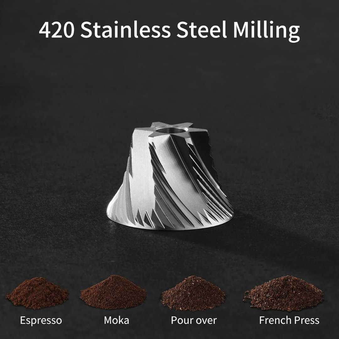 Cuenta con muelas cónicas de acero inoxidable de alto rendimiento que garantizan una molienda uniforme, precisa y sin sobrecalentamiento del grano. Su sistema de ajuste micrométrico mediante clics permite configurar el grosor exacto para cada método: espresso, V60, prensa francesa, AeroPress, entre otros.