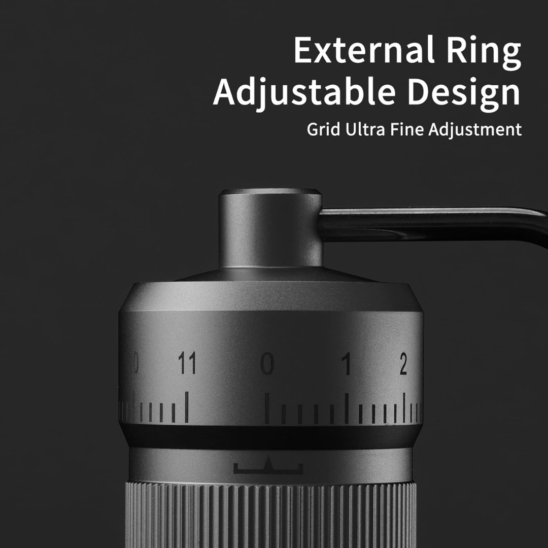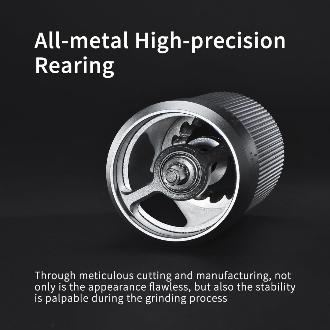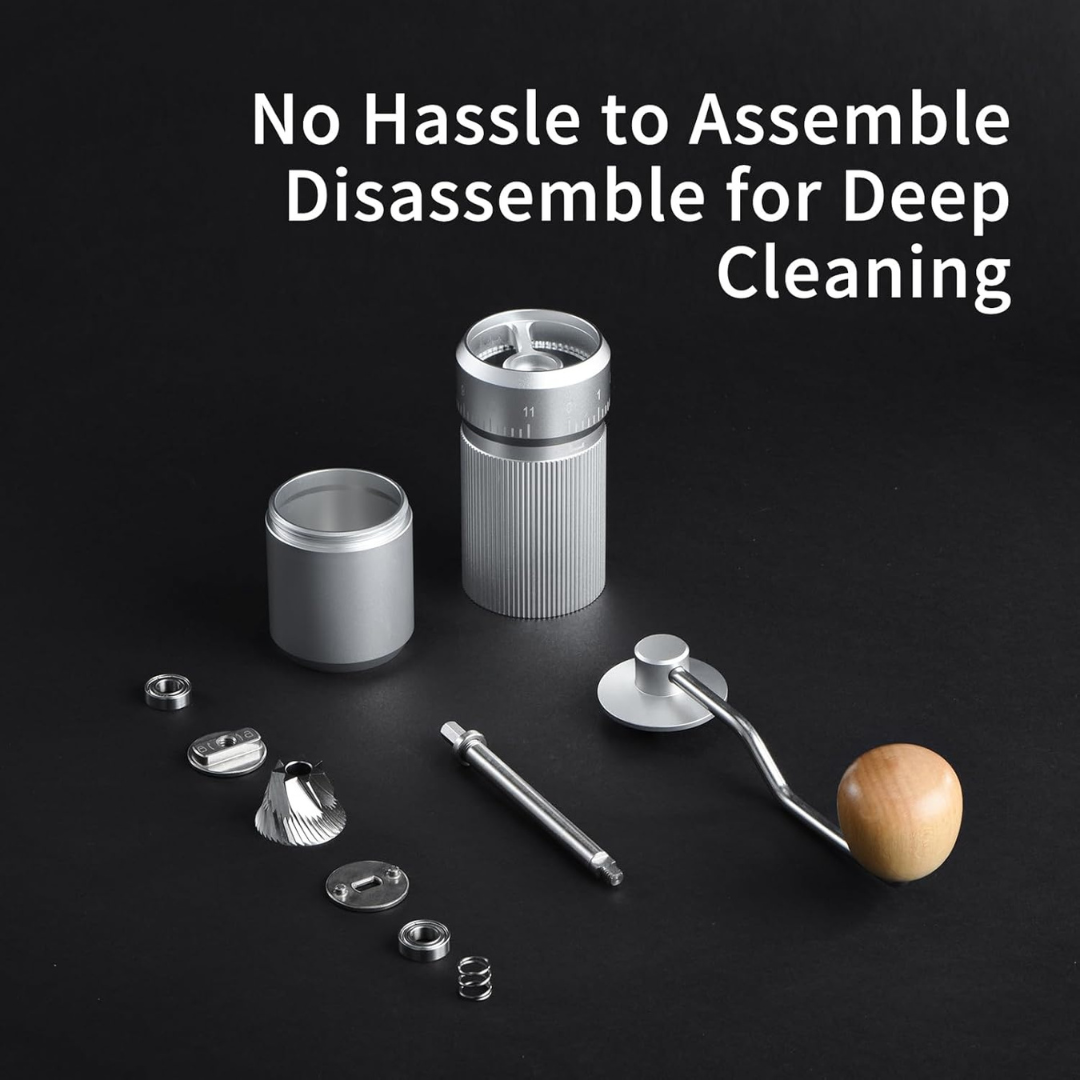 Este molinillo manual profesional es la herramienta ideal para los amantes del café que buscan control absoluto sobre la molienda. Su estructura de aluminio anodizado con acabado plateado combina durabilidad, diseño moderno y un agarre ergonómico para una experiencia de uso cómoda y fluida.