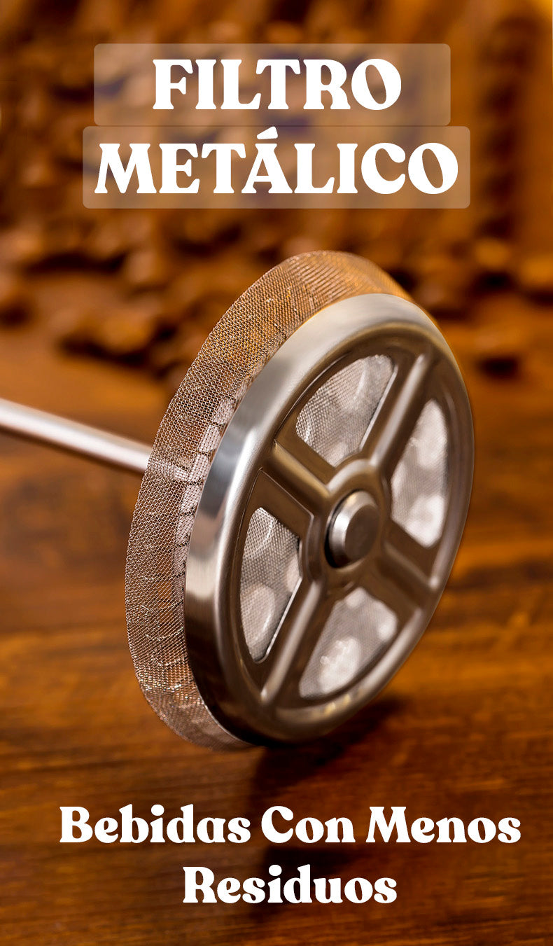 - Filtro de Acero: Asegura que los posos de café se mantengan fuera de tu taza, dejando solo el líquido más puro.
