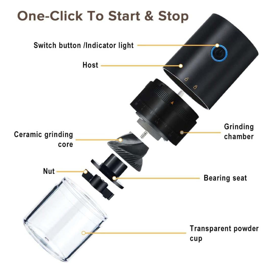 Este molino eléctrico portátil es la herramienta ideal para los amantes del café que valoran la frescura y la consistencia en cada taza. Su diseño compacto y elegante incluye un sistema de muelas cónicas que garantiza una molienda uniforme, conservando todos los aromas y aceites esenciales del grano.