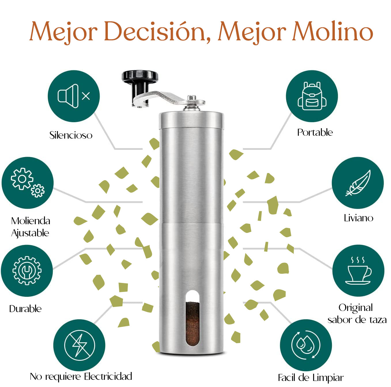 El secreto de un buen café que debes saber Una molienda acorde. Moler el café justo antes de prepararlo nos garantiza la calidad de la bebida; Al tener un café de calidad es lógico que busquemos su máximo aprovechamiento, por tal razón te traemos un molino pensando en lograr una taza de calidad; Desde cafetera italiana moka o mini expreso, no importa, podrás ajustar la molienda para obtener justo la que deseas. Su sistema de molienda evita ese molesto sabor metálico presente en otros molinos.