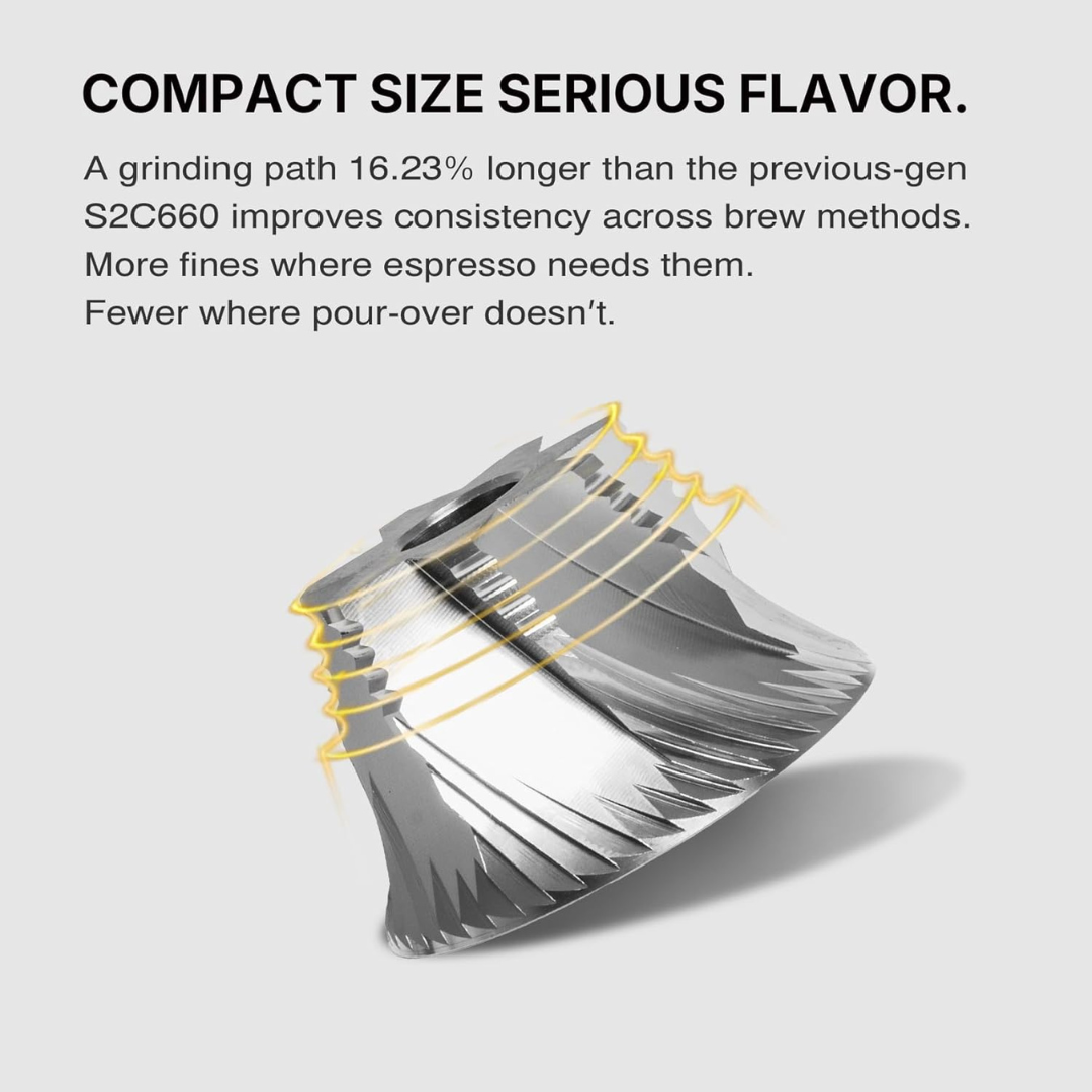 Este molino está diseñado para amantes del café que buscan precisión y calidad profesional, gracias a sus nuevas muelas cónicas de 42 mm ofrece una molienda más uniforme y rápida.