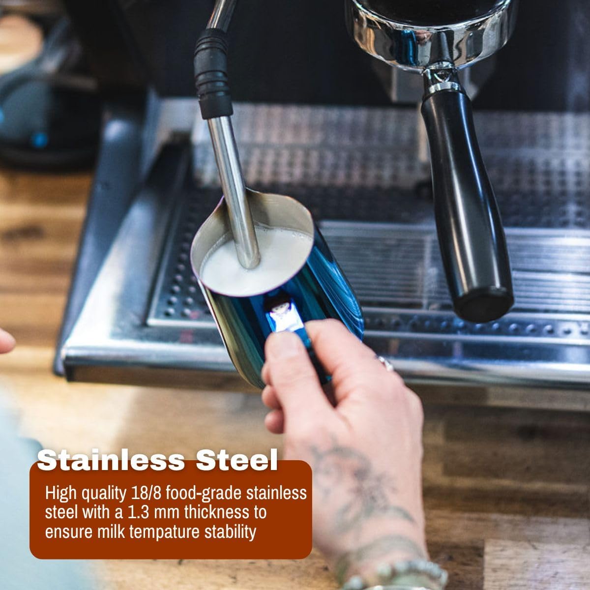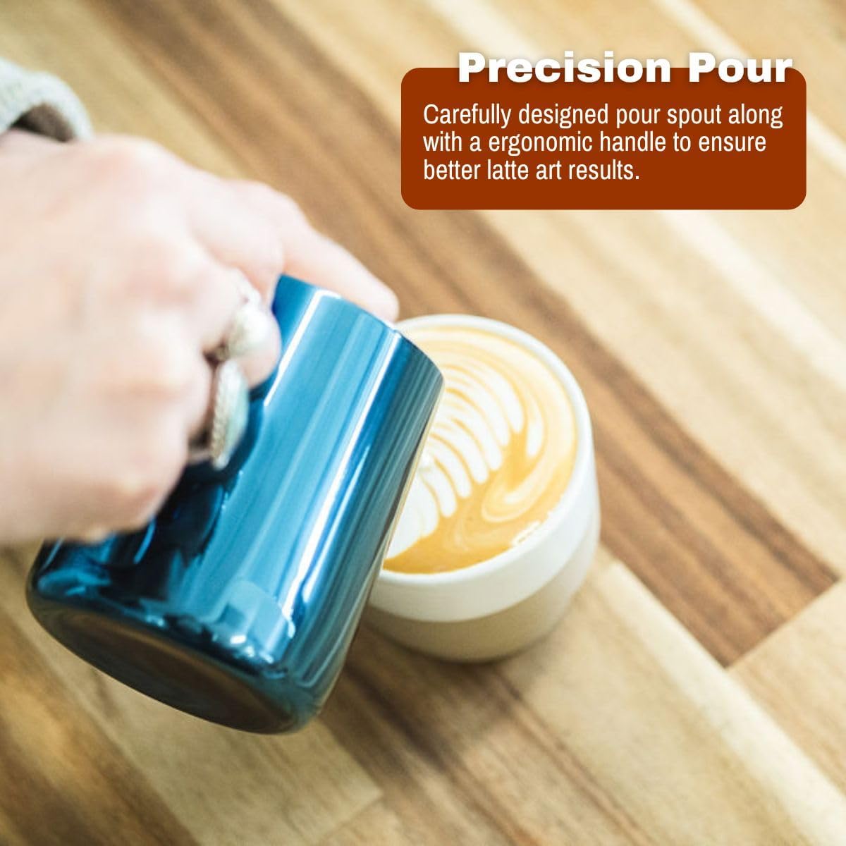La Jarra Cremadora de Acero Azul es el accesorio perfecto para crear texturas sedadas en la leche y preparar tus bebidas de café favoritas como un profesional. Su diseño elegante y acabado en color azul le dan un toque moderno y sofisticado a su equipo de barista, mientras que su construcción en acero inoxidable garantiza durabilidad y rendimiento en cada uso. Con capacidades de 350ml y 600ml, se adapta a diferentes necesidades y estilos de preparación.