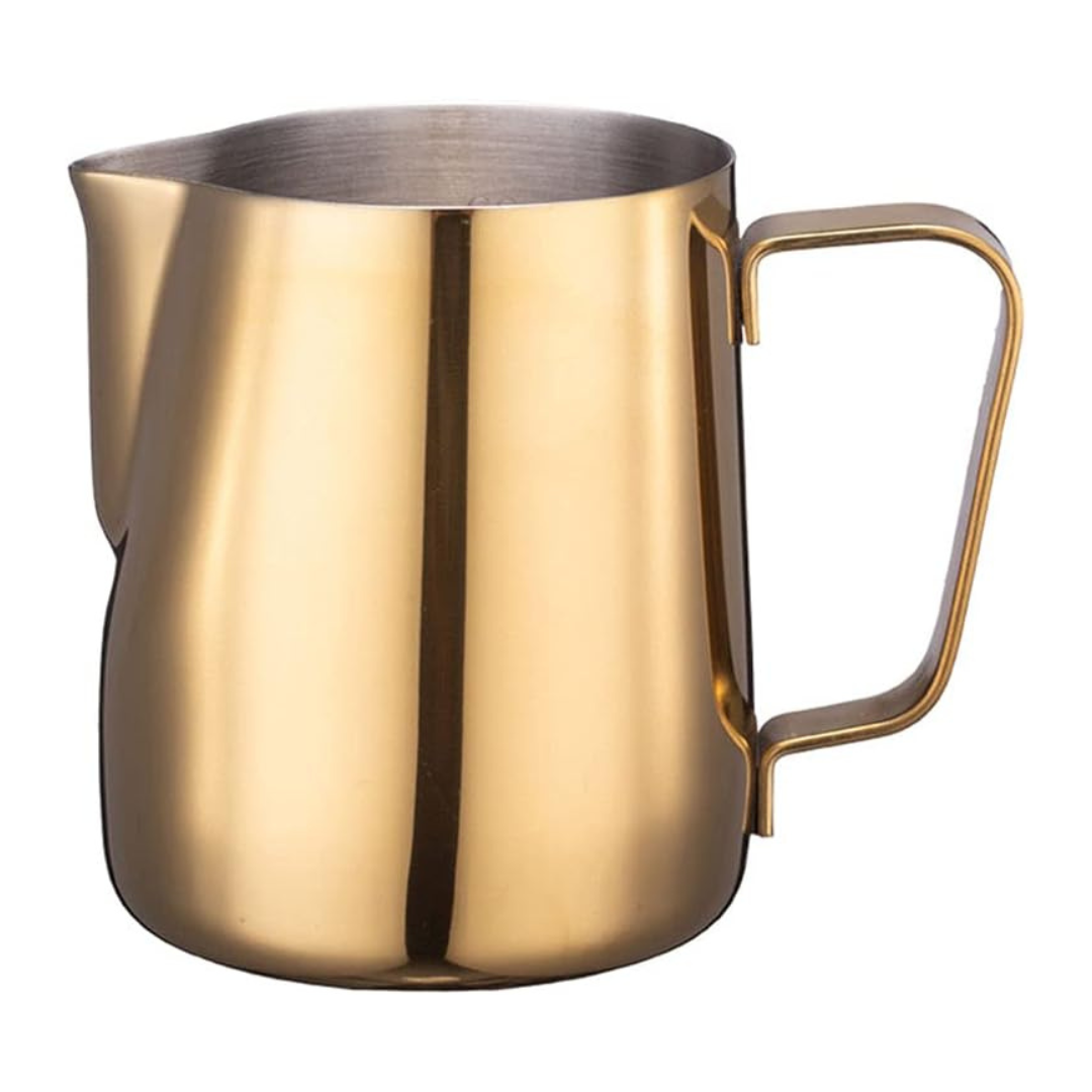 Fabricada en acero inoxidable de alta calidad, ofrece una excelente resistencia al calor y un acabado dorado que destaca en cualquier estación de café. Su pico vertedor de precisión permite realizar vertidos controlados ideales para latte art, mientras que su diseño ergonómico asegura un manejo cómodo durante el espumado y vertido de leche.
