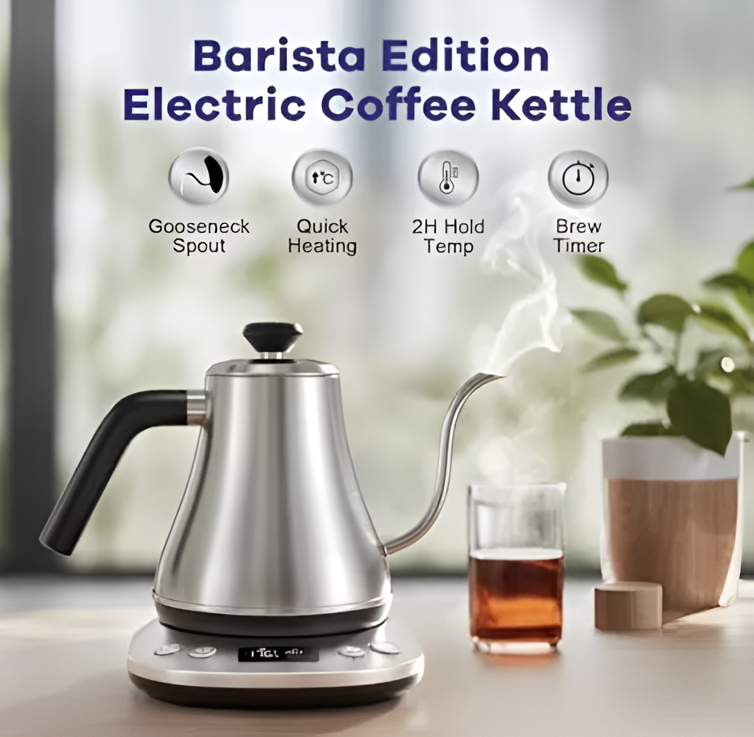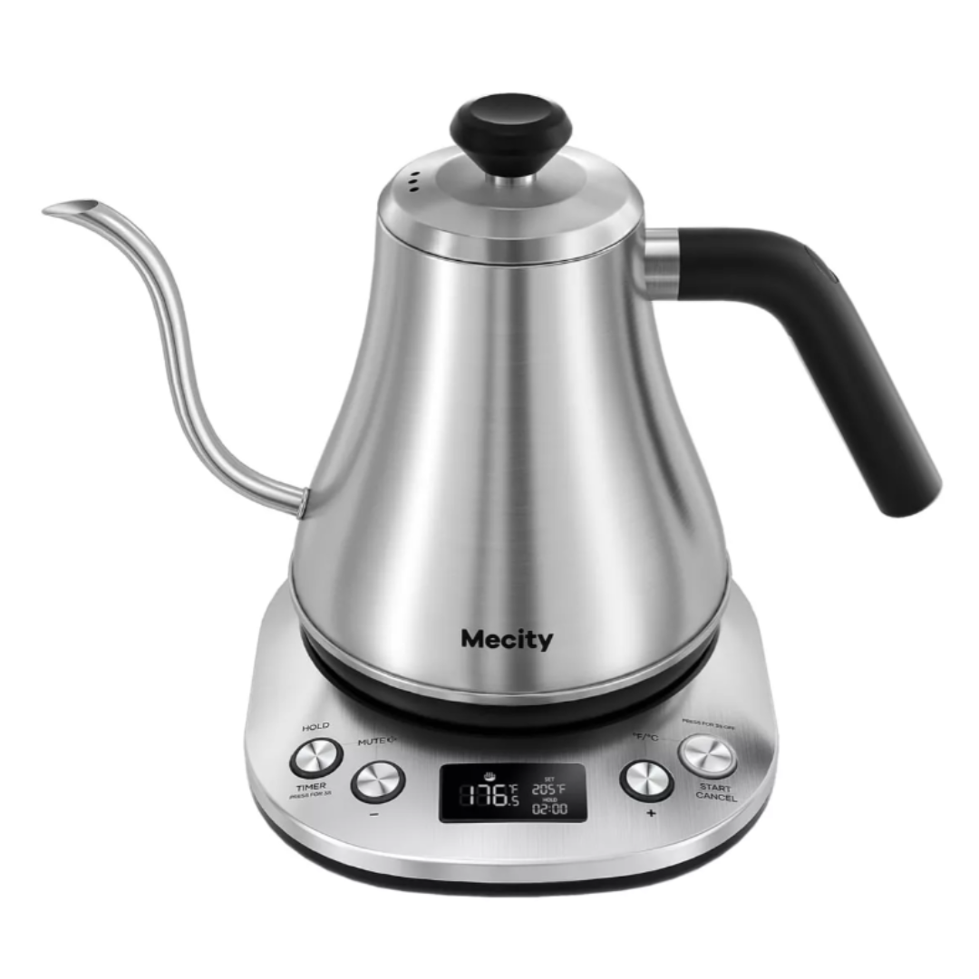 El Hervidor Eléctrico Mecity es el complemento perfecto para los amantes del café y el té. Su elegante diseño en color plata con un cuello de cisne permite un vertido preciso para métodos de preparación como el pour over. Equipado con una pantalla LCD de fácil lectura, este hervidor ofrece un control preciso de la temperatura para obtener siempre la infusión perfecta.