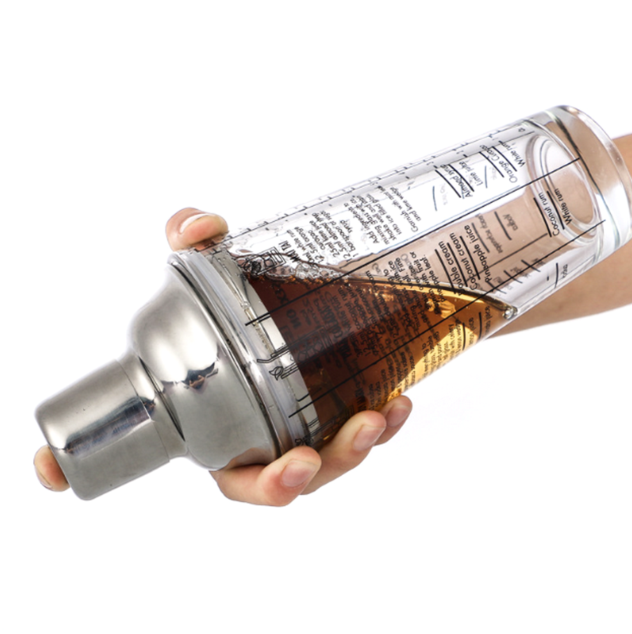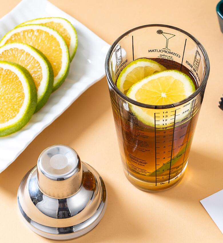 Prepara cócteles como un experto con esta coctelera medidora de vidrio de 400 ml, diseñada con marcas precisas y recetas impresas para facilitar cada mezcla. Ideal para uso en casa o barra, combina funcionalidad, estilo y precisión en un solo accesorio.